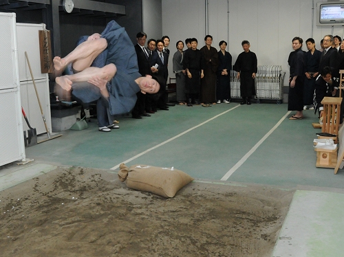 その後、砂場にお神酒をまいてお清めをしてから、いつも歌舞伎公演の舞台で激しい立廻りを勤めている若手俳優たちが、威勢良くとんぼの「返り初め」を行いました。
