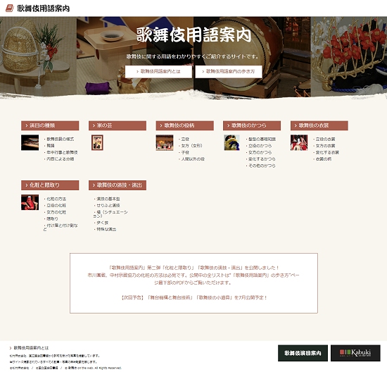「舞台機構と舞台技術」「歌舞伎の小道具」を7月公開予定。どうぞお楽しみに!