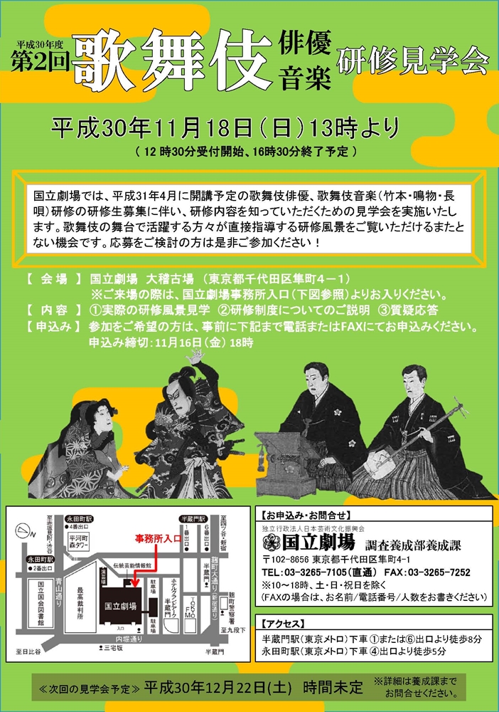 国立劇場では、平成31年4月に開講予定の歌舞伎俳優、歌舞伎音楽(竹本・鳴物・長唄)研修の研修生募集に伴い、研修内容を知っていただくための見学会を実施いたします。11月18日(日)に、第2回の見学会が実施されます。