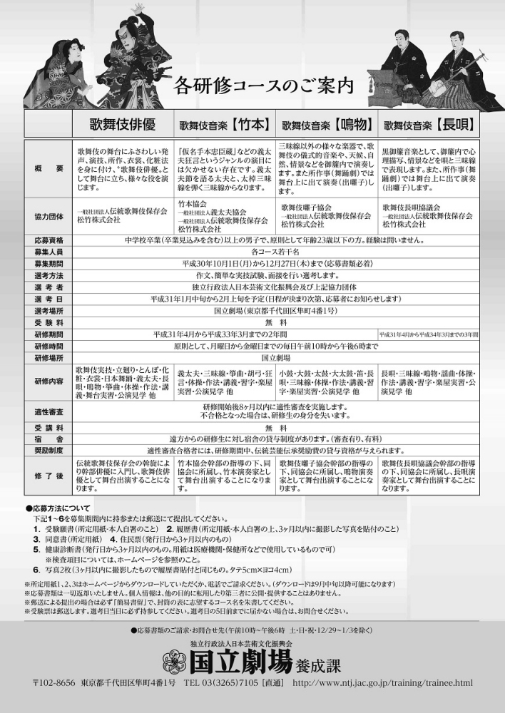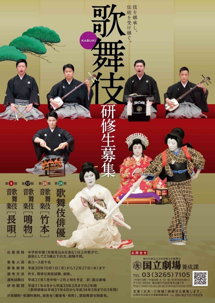 平成31年4月に開講される「第24期 歌舞伎俳優研修」「第24期 歌舞伎音楽(竹本)研修」「第17期 歌舞伎音楽(鳴物)研修」「第8期 歌舞伎音楽(長唄)研修」の研修生募集が開始されました。応募資格や方法など、詳しいことは日本芸術文化振興会の