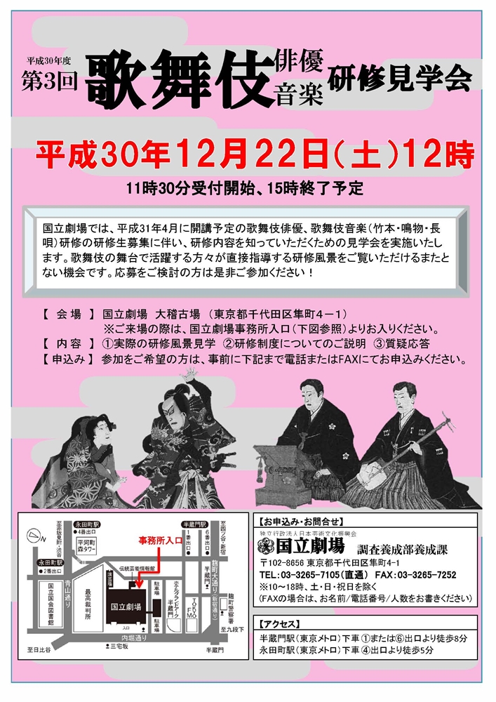 国立劇場では、平成31年4月に開講予定の歌舞伎俳優、歌舞伎音楽(竹本・鳴物・長唄)研修の研修生募集に伴い、研修内容を知っていただくための見学会を実施いたします。12月22日(土)に、第3回の見学会が実施されます。