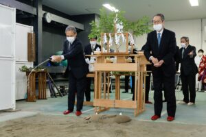 写真下)式の後、御神酒と塩で砂場を清める又五郎理事と浅原事務局長